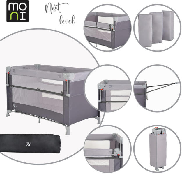 A Moni Next Level utazóágy, amely szürke színben pompázik, egyszerű, mégis stílusos modell, ami minden pihenés és játék esetén biztonságot nyújt. A bölcső lehajtható oldalfallal rendelkezik, amely még könnyebbé teszi a hozzáférést a kis csöppséghez. Kétféle magassági szint közül választhatunk, így a bölcső a gyermek növekedésével is könnyen használható marad. Egy igazi univerzális darab, amit minden utazás alkalmával magunkkal vihetünk. A modellezésnél a gyermek biztonsága volt az elsődleges szempont, a stabil szerkezet és a minőségi anyagok használata garantálja, hogy a bölcső minden körülmények között megfelelően működjön.
