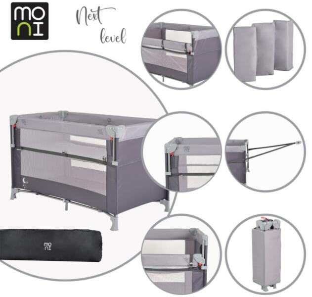A Moni Next Level utazóágy, amely szürke színben pompázik, egyszerű, mégis stílusos modell, ami minden pihenés és játék esetén biztonságot nyújt. A bölcső lehajtható oldalfallal rendelkezik, amely még könnyebbé teszi a hozzáférést a kis csöppséghez. Kétfé